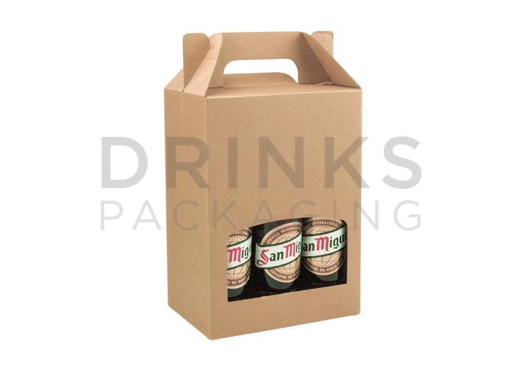 Our kraft 6 bottle gift box for 330ml bottles is of sturdy construction and features a strong carry handle for peace of mind. Upon construction, the window flaps fold inwards to provide a protective divider between bottles. Two additional inserts are supplied FOC. The first acts as a further divider between the bottles while a second features holes designed to secure the necks of the bottles for an additional layer of protection. This box is made exclusively from high-quality FSC sustainably sourced board that is 100% recyclable after use.